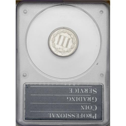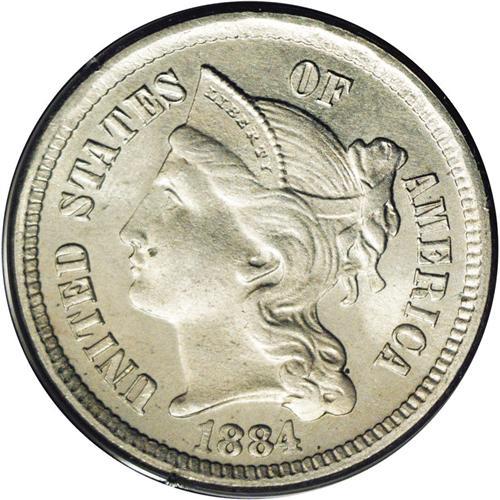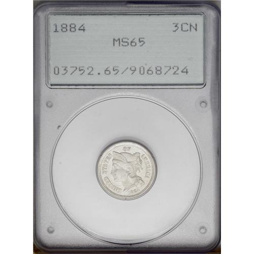 <B>1884<3CN> MS65 PCGS.</B></I> A comparatively unheralded rarity as a business strike that, in addition to a small mintage of 1,700 pieces, doesn't appear to have been widely saved at the time of issue. This frosty silver-gray representative is well struck, particularly on the reverse, and is just a few tiny carbon flecks from an even finer condition. Inspection is recommended, as we expect this first generation PCGS Gem to receive more than its share of attention. Population: 4 in 65, 2 finer (3/06). <BR><BR><B>Important notice:</B> Heritage usually auctions material at the rate of 200-250 lots per hour. On some occasions eBay Live bid software or the Internet may not be able to keep up with the pace of the auction. We recommend placing a realistic absentee bid now as insurance to avoid disappointment. Occasionally the auctioneer may eliminate or reject an eBay Live bid, and the auctioneer may also reopen a lot after the close of the eBay live bidding (usually because we missed an audience bid), and may reject your bid even if it shows you as the winning bidder. By bidding via eBay Live, you agree that Heritage may award the lot to another bidder at its sole discretion under the circumstances described above or any other reasonable circumstances. Since eBay bids are not shown to us until we open the lot on the floor, we treat those bids just like floor bids. In most cases the floor responds before the eBay bid is presented to us, due to Internet lag time, so for consistency we have made it a policy that floor bids are always considered first over tie eBay live bids. Also please note that all Heritage lots purchased through eBay Live carry a 20% Buyer's Premium. Please make sure you read the Terms and Conditions before you bid. This lot is being auctioned in conjunction with a live floor auction by Heritage Galleries & Auctioneers. All final auction and invoice information will be supplied by Heritage Galleries & Auctioneers, and all other information should be considered preliminary. Lot:788 <BR><BR><B>Winning Notification and Billing:</B> After the FINAL session in this auction is complete, Heritage will send e-mail and snail mail invoices. This process normally takes several days. All final auction and invoice information will be supplied by Heritage Galleries & Auctioneers, and all other information should be considered preliminary. <BR><BR>This auction will be conducted on a live auction floor and over the Internet through eBay Live. If you choose to place an absentee bid, please take a moment to <font color='#0000ff'><u><a href='http://pages.ebay.com/liveauctions/help/before/laabsentee.html'>learn how eBay Live absentee bidding works</a></u></font><font color='#000000'>