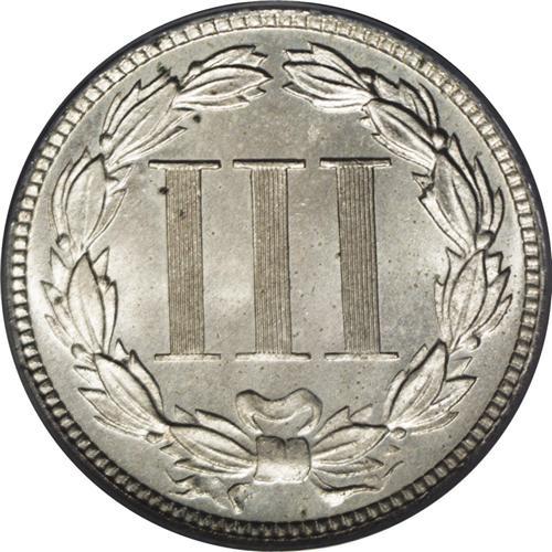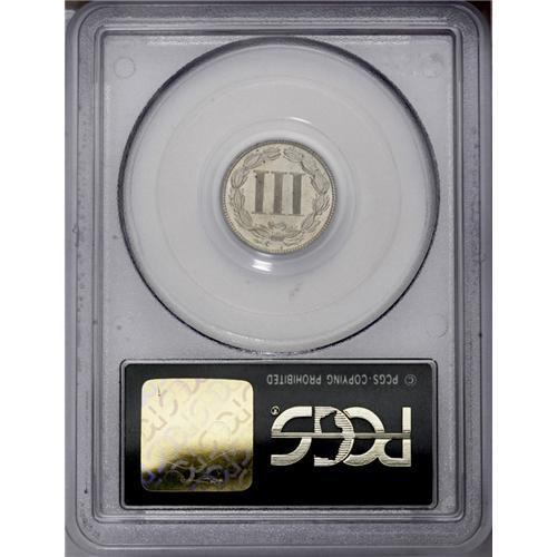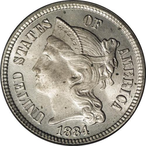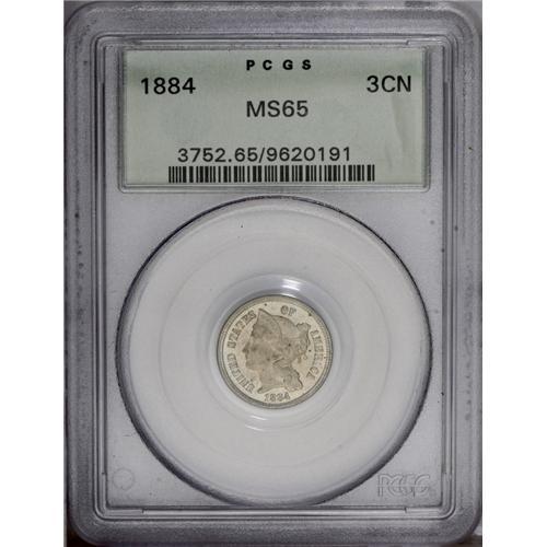 <B>1884<3CN> MS65 PCGS.</B></I> A rare and desirable coin in Gem grades. Examination will discover a couple of specks on both sides, including one below the E of AMERICA which will serve to identify this rarity. Hints of light yellow are seen on the obverse, the reverse similar with nickel-gray in abundance. Fully struck by the dies with strong definition on the denomination and wreath, as well as on Liberty's curls. The Philadelphia Mint coined a total of 1,700 pieces in 1884, and few were saved from the time of issue. For the date specialist, this coin would make a welcome addition to any collection. Housed in an older green insert PCGS holder. Population: 4 in 65, 2 finer (1/06).