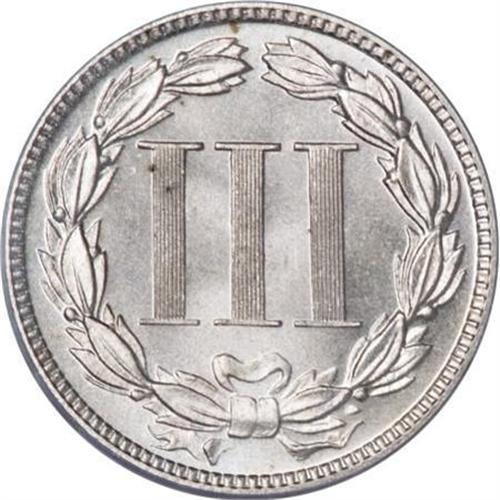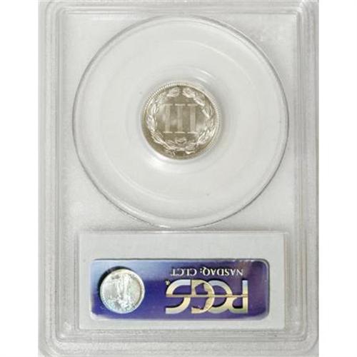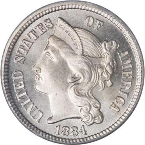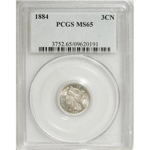 <B>1884 3CN MS65 PCGS.</B></I> A rare and desirable coin in Gem grades. Close examination will reveal a couple of specks on both sides, including one below the E of AMERICA which serve to identify this rarity. Hints of pale blue are seen on the obverse, the reverse similar with nickel-gray in abundance. Fully struck with strong definition on the denomination and wreath, as well as on Liberty's curls. The Philadelphia Mint coined a total of 1,700 pieces in 1884, and few were saved from the time of issue. For the date specialist, this coin would make a welcome addition to any collection. Housed in an older green insert PCGS holder. Population: 4 in 65, 2 finer (1/08).<BR><BR><B>Coin Engraver:</B> James B. Longacre<BR><BR><b>Shipping:</b> Coins & Currency (<a target="_blank" href="http://www.heritageauctions.com/common/shipping.php">view shipping information</a>)