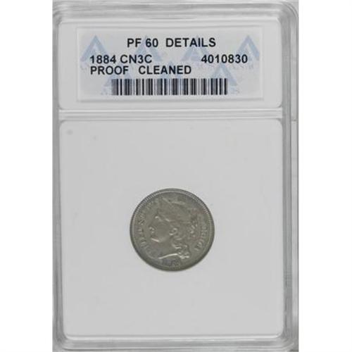 <B>1884 3CN --Cleaned--ANACS. PR60 Details.</B></I> NGC Census: (0/870). PCGS Population (2/1021). Mintage: 3,942. Numismedia Wsl. Price for NGC/PCGS coin in PR60: $195. (#3780)<BR><BR><B>Coin Engraver:</B> James B. Longacre<BR><BR><b>Shipping:</b> Coins & Currency (<a target="_blank" href="http://www.heritageauctions.com/common/shipping.php">view shipping information</a>)