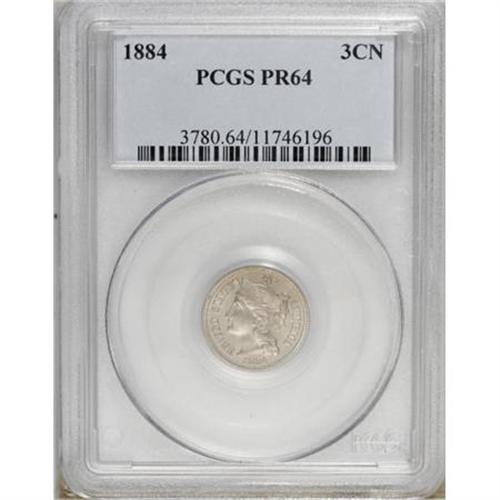 <B>1884 3CN PR64 PCGS.</B></I> PCGS Population (335/558). NGC Census: (216/589). Mintage: 3,942. Numismedia Wsl. Price for NGC/PCGS coin in PR64: $340. (#3780)<BR><BR><B>Coin Engraver:</B> James B. Longacre<BR><BR><b>Shipping:</b> Coins & Currency (<a target="_blank" href="http://www.heritageauctions.com/common/shipping.php">view shipping information</a>)