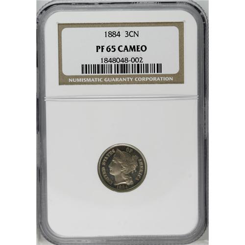 <B>1884<3CN> PR65 Cameo NGC.</B></I> The deeply mirrored fields are starkly contrasted against the thick mint frost that covers the devices. The cameo effect is noticeable even through the golden-rose toning that is seen on each side and turns to light blue at the margins.