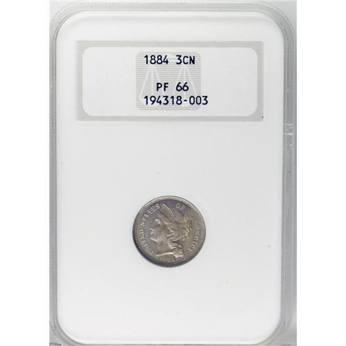 <B>1884 3CN PR66 NGC.</B></I> A satiny and essentially immaculate Premium Gem. The major devices are needle-sharp, and the strike is only incomplete on the denticles. Original blended chestnut-brown and dove-gray toning ensures the eye appeal. Housed in a prior generation holder.<BR><I>From The Jones Beach Collection.</B></I><BR><BR><b>Shipping:</b> Coin/Currency (<a target="_blank" href="http://www.heritageauctions.com/common/shipping.php">view shipping information</a>)