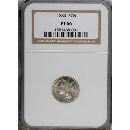 <B>1884 3CN PR66 NGC.</B></I> NGC Census: (216/38). PCGS Population (179/42). Mintage: 3,942. Numismedia Wsl. Price for NGC/PCGS coin in PR66: $710. (#3780)<BR><BR><B>Coin Engraver:</B> James B. Longacre<BR><BR><b>Shipping:</b> Coins & Currency (<a target="_blank" href="http://www.heritageauctions.com/common/shipping.php">view shipping information</a>)