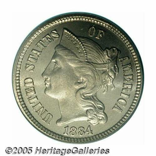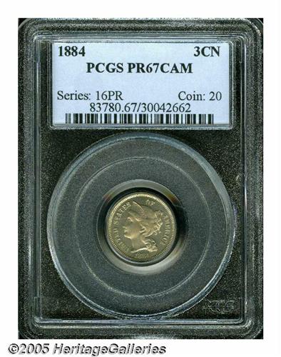 <B>1884<3CN> PR67 Cameo PCGS.</B></I> Some opaque, reddish-golden color lightly accents each side. Exquisitely struck with a pronounced cameo appearance. The surfaces are immaculately preserved. Population: 16 in 67, 1 finer (4/05).<BR><I>From The Western Hills Collection.</B></I>
