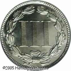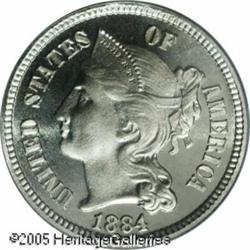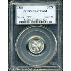 <B>1884 3CN PR67 Cameo PCGS.</B></I> This splendid Superb Gem has fully brilliant obverse and reverse surfaces with excellent eye appeal. An unusual Cameo proof example with deeply mirrored fields and lovely surfaces. When collecting these issues, cherrypicking for quality and eye appeal is recommended as few survivors have such a good appearance.<BR><I>From The Mike Jacobson Collection.</B></I> Lot:5761