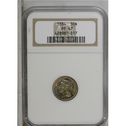 <B>1884 3CN PR67 NGC.</B></I> Orange-gold patina graces this remarkably well-preserved Superb Gem. Hardly any flaws are visible to the unaided eye. Census: 37 in 67, 1 finer (10/06).<BR><BR><b>Shipping:</b> Coin/Currency (<a target="_blank" href="http://www.heritageauctions.com/common/shipping.php">view shipping information</a>)