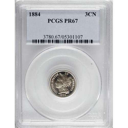 <B>1884 3CN PR67 PCGS.</B></I> PCGS Population (40/2). NGC Census: (37/1). Mintage: 3,942. Numismedia Wsl. Price for NGC/PCGS coin in PR67: $1,200. (#3780)<BR><BR><B>Coin Engraver:</B> James B. Longacre<BR><BR><b>Shipping:</b> Coins & Currency (<a target="_blank" href="http://www.heritageauctions.com/common/shipping.php">view shipping information</a>\)