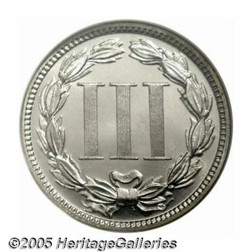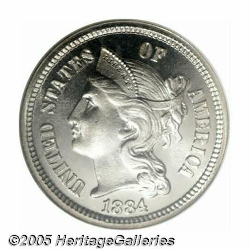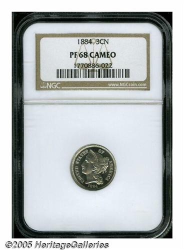 <B>1884<3CN> PR68 Cameo NGC.</B></I> Few proof Three Cent Nickel issues were produced with the care given to those struck in 1884. The location of a Cameo is not a particularly difficult task, with most tending to be Choice or better quality. The dazzling, fully brilliant specimen offered here is a cut above what is normally seen, being as nice as we have ever encountered. Population: 2 in 68 Cameo, 0 finer (4/05).<BR><I>From The Western Hills Collection.</B></I>