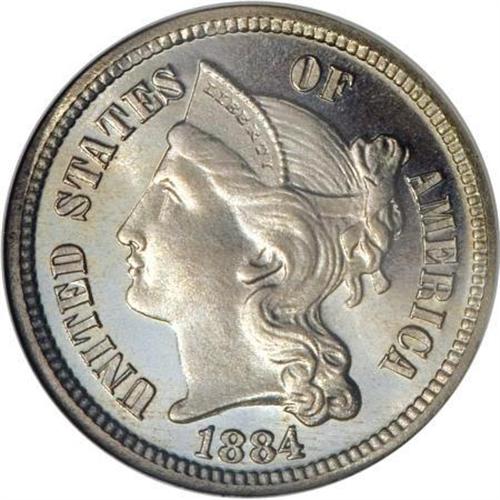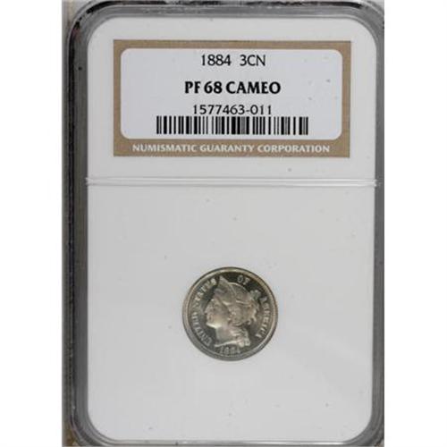 <B>1884 3CN PR68 Cameo NGC.</B></I> A relatively large number of survivors are known from the nearly 4,000 piece mintage of 1884 three cent nickels. While extant Cameos are fewer in number, they can still be located with some searching in PR63 to PR65. Examples in the lofty grade of PR68 Cameo, however, are quite elusive. This lightly toned specimen exhibits a full strike and virtually pristine surfaces with pronounced field-motif contrast. Census: 2 in 68 Cameo, 0 finer (10/07).<BR><BR><b>Shipping:</b> Coins & Currency (<a target="_blank" href="http://www.heritageauctions.com/common/shipping.php">view shipping information</a>)