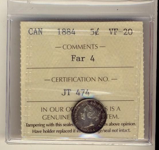 1884 5¢ Far 4 ICCS VF20. Problem free. Key date.