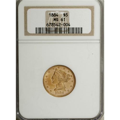 <B>1884 $5 MS61 NGC.</B></I> NGC Census: (144/122). PCGS Population (14/42). Mintage: 191,078. Numismedia Wsl. Price for NGC/PCGS coin in MS61: $650. (#8364)<BR><BR><b>Shipping:</b> Coins & Currency (<a target="_blank" href="http://www.heritageauctions.com/common/shipping.php">view shipping information</a>)