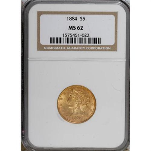 <B>1884 $5 MS62 NGC.</B></I> Somewhat subdued luster emanates from the lightly abraded surfaces of this 1884 five dollar. Generally well struck, with peach-gold patina. Increasingly rare in choice condition. Census: 45 in 62, 18 finer (6/07).<BR><BR><b>Shipping:</b> Coins & Currency (<a target="_blank" href="http://www.heritageauctions.com/common/shipping.php">view shipping information</a>)