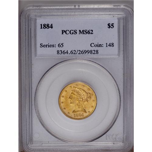 <B>1884 $5 MS62 PCGS.</B></I> Both sides exhibit numerous ticks, bagmarks, and other contact, but the strike is well executed and the color is an appealing and consistent reddish-gold on both sides. Population: 20 in 62, 15 finer (1/06).