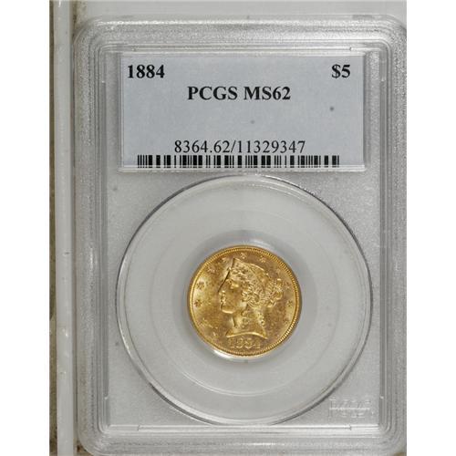 <B>1884 $5 MS62 PCGS.</B></I> This flashy 1884 half eagle has just a few too many bagmarks for a higher grade. Regardless, the peach-surfaces exhibit well struck design elements, except for minor softness on the eagle's neck.<BR><BR><b>Shipping:</b> Coins & Currency (<a target="_blank" href="http://www.heritageauctions.com/common/shipping.php">view shipping information</a>)