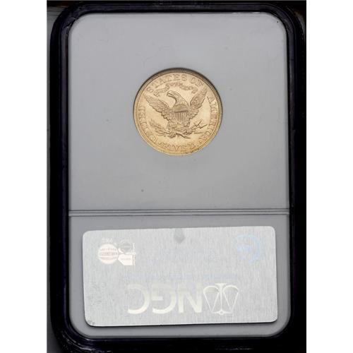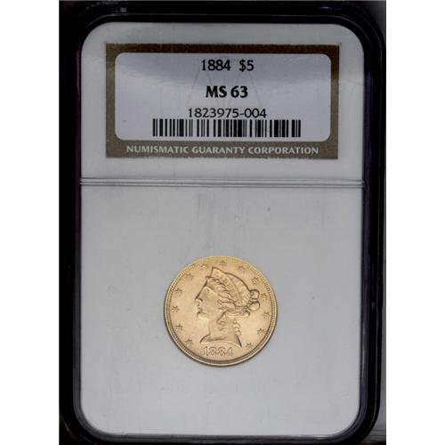 <B>1884<$5> MS63 NGC.</B></I> Highly lustrous with wheat-gold surfaces and plenty of detail. Small abrasions, including a few on Liberty's cheek, restrict the grade. Census: 14 in 63, 4 finer (7/06).