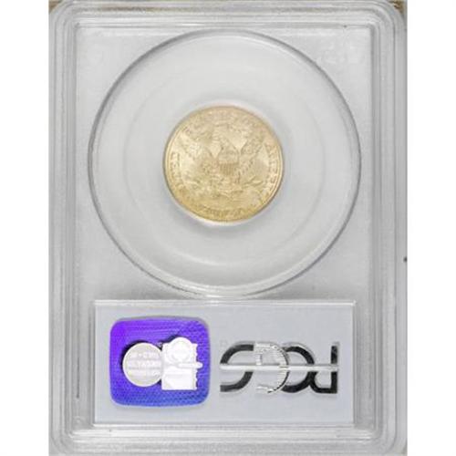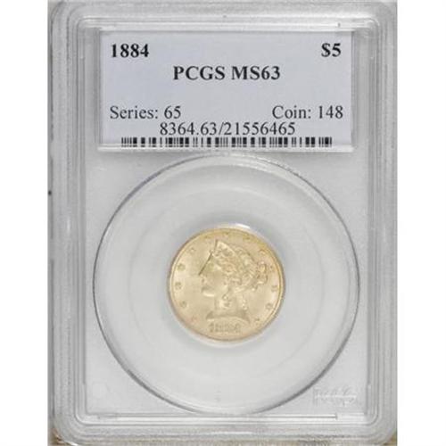 <B>1884 $5 MS63 PCGS.</B></I> While scarce in MS63, this issue becomes rare in finer grades, with PCGS grading only three higher (11/07). Highly lustrous with straw-gold surfaces and a pleasant strike. Small abrasions restrict the grade.<BR><BR><B>Coin Engraver:</B> Christian Gobrecht<BR><BR><b>Shipping:</b> Coins & Currency (<a target="_blank" href="http://www.heritageauctions.com/common/shipping.php">view shipping information</a>)