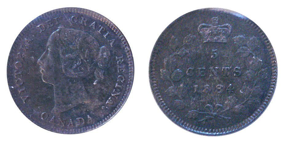 1884 5¢ Near 4 ICCS MS62. Superb and attractive irridescent toning with full underlying lustre. Excessively scarce and desirable. Only 3 examples finer.
