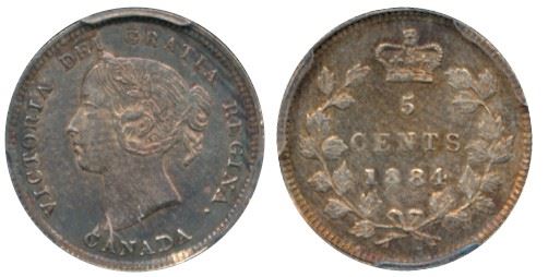 1884 5¢ PCGS AU58. Deep red and blue tones. Scarce in near mintstate condition.