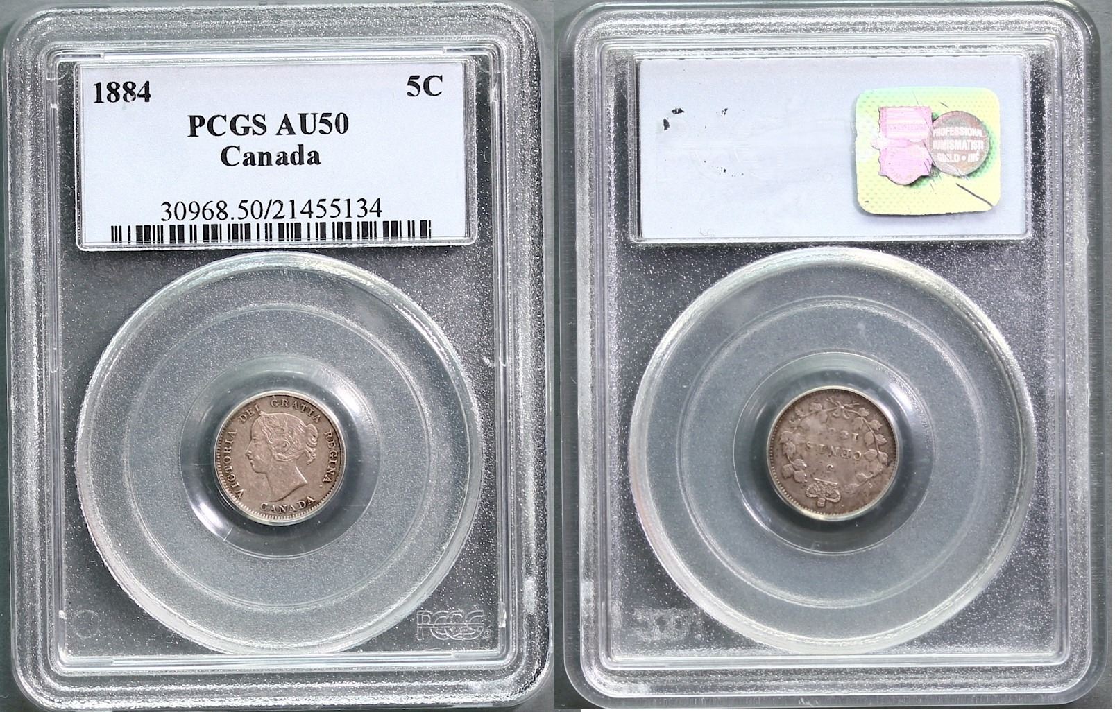 1884 5¢ PCGS About Uncirculated-50. A decent key issue with soft greyish tones.