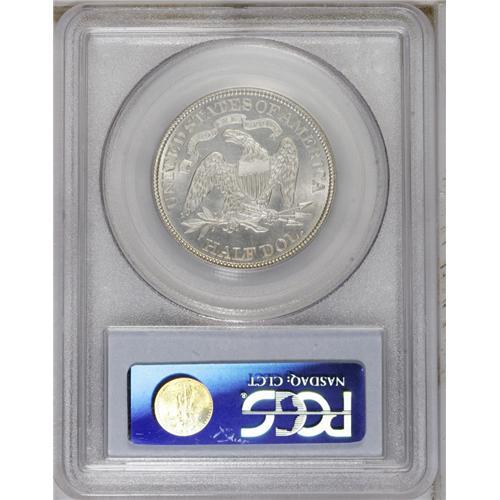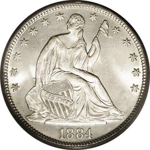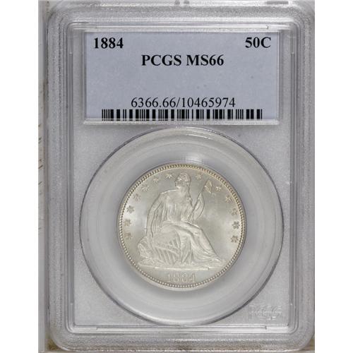 <B>1884<50C> MS66 PCGS.</B></I> WB-102. The P-mint Seated halves from 1879 to 1890 have tiny mintages, as series specialists can attest. This is due primarily to the millions of Morgan dollars that the Philadelphia Mint pumped out with annual celerity, mandated by the Bland-Allison Act. Mintages of Seated half dollars, ranged during this era from 4,400 to 12,001 business strikes per year. Of them all, the 1882 and 1884 mintages are tied for the smallest--4,400 pieces each year. Judging by the certified population data, collectors and/or the general public were certainly aware of the tiny mintages, as the numbers extant today are several times the typical surviving population. This untoned, prooflike piece has high field-device contrast, and only the most minor distractions. Struck from the business-strike die, showing minor recutting on the base of the 4. Population: 11 in 66, 4 finer (9/06).