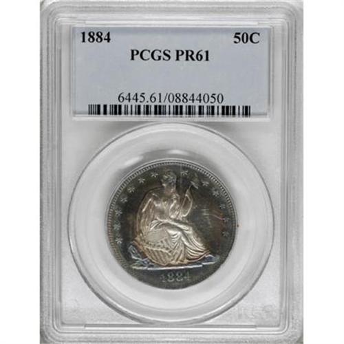<B>1884 50C PR61 PCGS.</B></I> Rich steel-gray and blue-green toning appears in rings around minimally patinated centers. Crisply struck with a number of hairlines and a handful of contact marks in the fields.<BR><BR><B>Coin Engraver:</B> Christian Gobrecht<BR><BR><b>Shipping:</b> Coins & Currency (<a target="_blank" href="http://www.heritageauctions.com/common/shipping.php">view shipping information</a>)