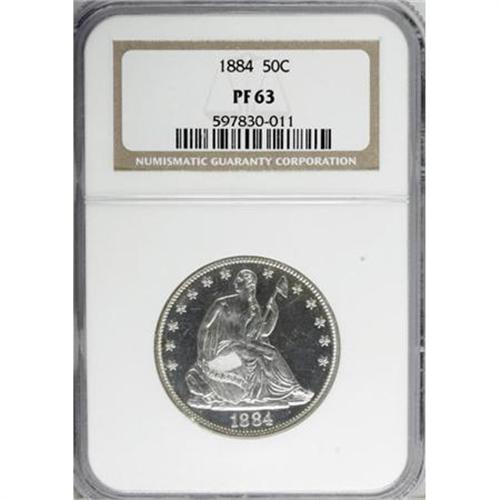 <B>1884 50C PR63 NGC.</B></I> NGC Census: (30/99). PCGS Population (67/90). Mintage: 875. Numismedia Wsl. Price for NGC/PCGS coin in PR63: $850. (#6445)<BR><BR><B>Coin Engraver:</B> Christian Gobrecht<BR><BR><b>Shipping:</b> Coins & Currency (<a target="_blank" href="http://www.heritageauctions.com/common/shipping.php">view shipping information</a>\)