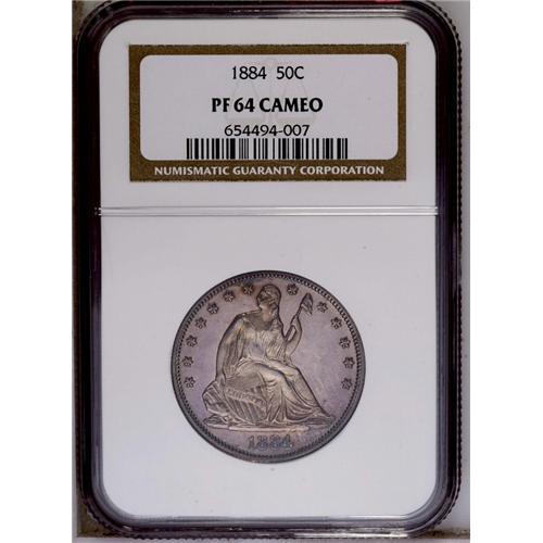 <B>1884<50C> PR64 Cameo NGC.</B></I> This is an impressive near-Gem example with deep steel color in the fields and lighter gold toning on the devices, accentuating the Cameo contrast. A few trivial hairlines and other tiny blemishes limit the grade and prevent a Gem determination. <BR><BR><B>Important notice:</B> Heritage usually auctions material at the rate of 200-250 lots per hour. On some occasions eBay Live bid software or the Internet may not be able to keep up with the pace of the auction. We recommend placing a realistic absentee bid now as insurance to avoid disappointment. Occasionally the auctioneer may eliminate or reject an eBay Live bid, and the auctioneer may also reopen a lot after the close of the eBay live bidding (usually because we missed an audience bid), and may reject your bid even if it shows you as the winning bidder. By bidding via eBay Live, you agree that Heritage may award the lot to another bidder at its sole discretion under the circumstances described above or any other reasonable circumstances. Since eBay bids are not shown to us until we open the lot on the floor, we treat those bids just like floor bids. In most cases the floor responds before the eBay bid is presented to us, due to Internet lag time, so for consistency we have made it a policy that floor bids are always considered first over tie eBay live bids. Also please note that all Heritage lots purchased through eBay Live carry a 20% Buyer's Premium. Please make sure you read the Terms and Conditions before you bid. This lot is being auctioned in conjunction with a live floor auction by Heritage Galleries & Auctioneers. All final auction and invoice information will be supplied by Heritage Galleries & Auctioneers, and all other information should be considered preliminary. Lot:2036 <BR><BR><B>Winning Notification and Billing:</B> After the FINAL session in this auction is complete, Heritage will send e-mail and snail mail invoices. This process normally takes several days. All final auction and invoice information will be supplied by Heritage Galleries & Auctioneers, and all other information should be considered preliminary. <BR><BR>This auction will be conducted on a live auction floor and over the Internet through eBay Live. If you choose to place an absentee bid, please take a moment to <font color='#0000ff'><u><a href='http://pages.ebay.com/liveauctions/help/before/laabsentee.html'>learn how eBay Live absentee bidding works</a></u></font><font color='#000000'>