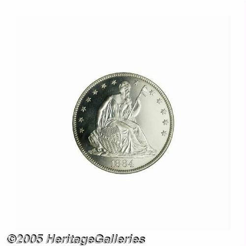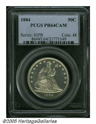 <B>1884<50C> PR64 Cameo PCGS.</B></I> A brilliant and suitably struck Choice proof that has noticeable white on black contrast. The reverse is well preserved, while the obverse has a number of scattered hairlines that limit the grade. The base of the 1 in the date is lightly recut.