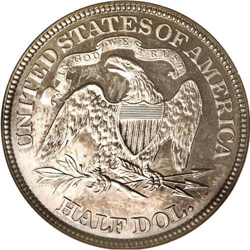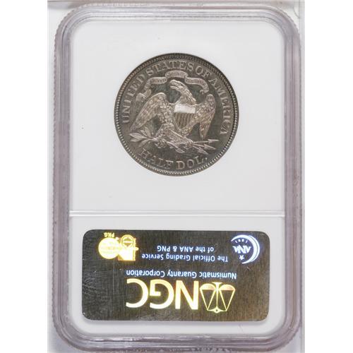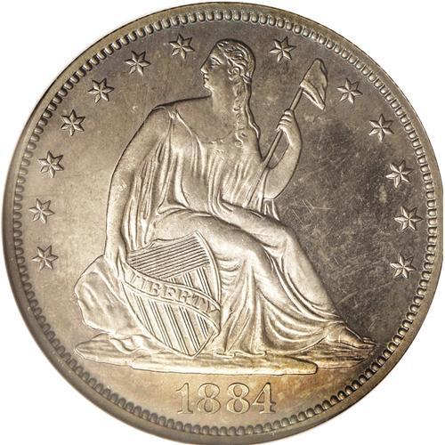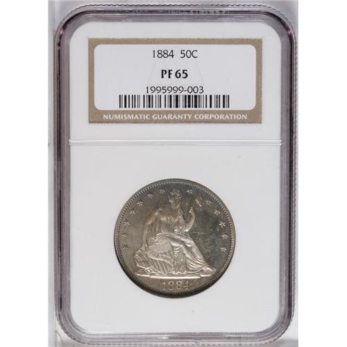<B>1884<50C> PR65 NGC.</B></I> The extremely low mintages of quarters and half dollars from 1879 through 1890 at the Philadelphia Mint puts added pressure on proofs of that era from collectors seeking a choice example. So it is with this Gem piece, one of only 875 proofs made, compared with 4,400 business strikes. This lustrous specimen shows light pinkish-silver toning, more prominent on the upper portion of each side. Few distractions are seen, even under a loupe. Census: 26 in 65, 17 finer (7/06).