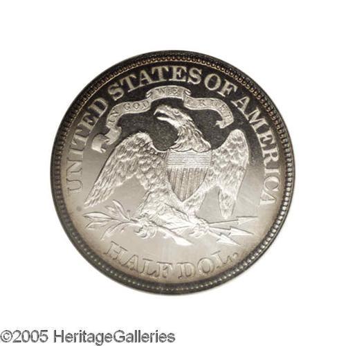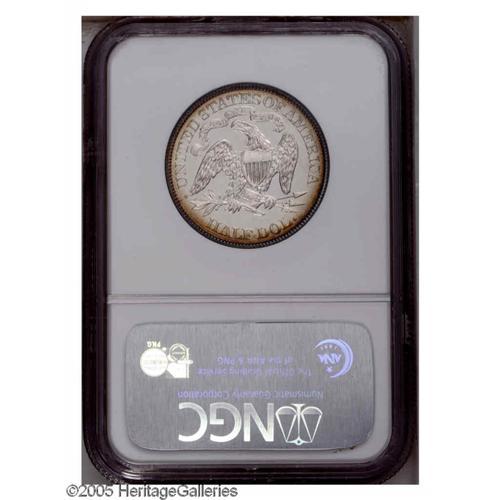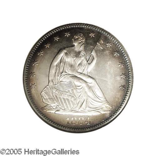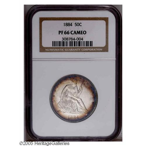 <B>1884<50C> PR66 Cameo NGC.</B></I> Golden-brown and navy-blue colors bathe the borders of this lovely premium Gem. The devices are thickly frosted and ensure the eye appeal. Crisply struck, although the planchet prior to the strike had a moderately grainy texture that was not completely effaced by the blows from the dies. The 1 in the date exhibits light recutting along the lower left portion of the upright. The 1884 has a mintage of 875 proofs and 4,400 business strikes. Census: 7 in 66 Cameo, 2 finer (10/05).
