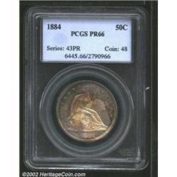 1884 50C PR66 PCGS. This is an interesting example from the standpoint of toning. The majority of the surface area displays silver-gray color, but there are irregular splashes of orange-gold, lilac-gray, and cobalt-blue iridescence scattered about. Shining powerfully through this toning one can discern reflective fields, and the smooth, fully brought up devices are no less evident. A lone spot at 5 o'clock on the obverse periphery is noted for accuracy. Population: 7 in 66, only three are finer (7/02). Important notice: We expect to be auctioning lots at the rate of 200-250 per hour. Sometimes eBay Premier live bid software cannot keep up with that pace, so we strongly recommend that you place a realistic proxy bid now as insurance to avoid disappointment. Also please note that all Heritage/CAA lots purchased through eBay Premier carry a 20% Buyer's Premium. Please make sure you read the Terms and Conditions.