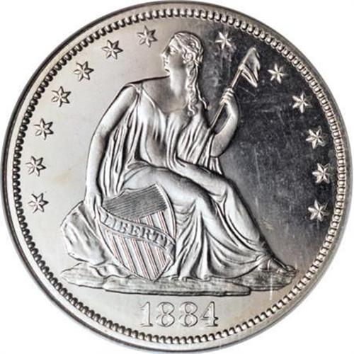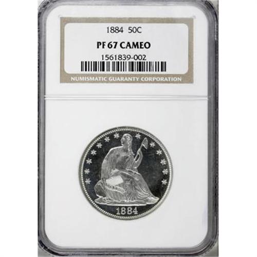 <B>1884 50C PR67 Cameo NGC.</B></I> The half dollar saw a production of 875 proofs in 1884. While this issue is readily available to collectors, as hundreds of examples were saved and subsequently certified by NGC and PCGS, relatively few coins qualify as Cameos. In fact, fewer than 50 examples are so designated by NGC and PCGS, particularly at the higher levels of preservation. <BR> This Superb Gem Cameo is one of the four graded by the two services, with none seen finer (11/07). Completely untoned surfaces yield a delightful white-on-black contrast, and are immaculately preserved. In addition to these wonderful attributes, all of the design elements are sharply impressed.<BR><BR><b>Shipping:</b> Coins & Currency (<a target="_blank" href="http://www.heritageauctions.com/common/shipping.php">view shipping information</a>)