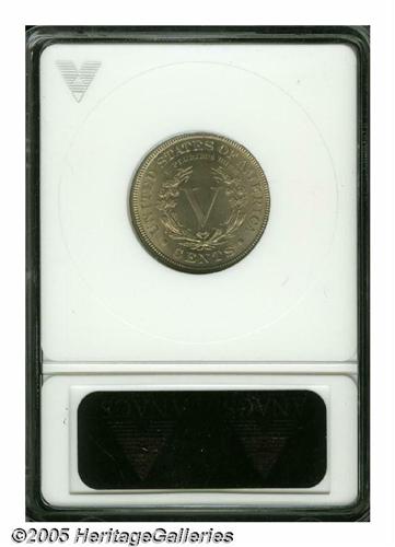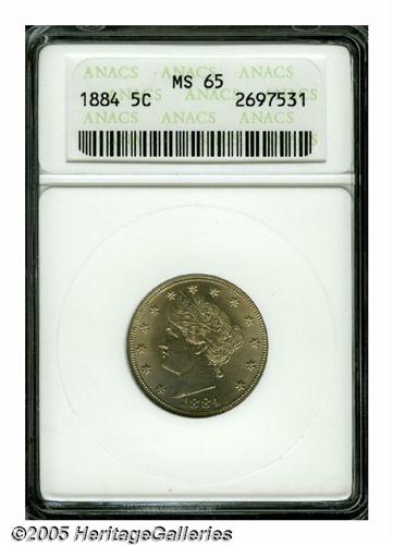 <B>1884<5C> MS65 ANACS.</B></I> Pleasing champagne color overruns lustrous surfaces that are remarkably smooth and well preserved, revealing just a couple of trivial marks on Liberty's eyebrow and cheek. The design elements are well impressed, including the typically soft corn ear in the left (facing) reverse. The 1884 becomes scarce in Gem and finer grades.