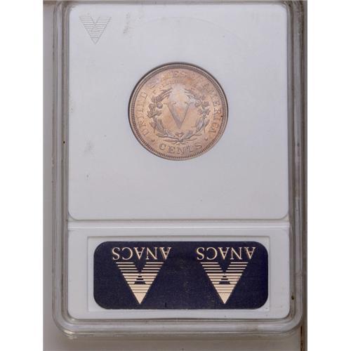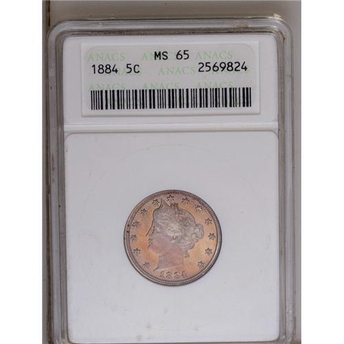 <B>1884<5C> MS65 ANACS.</B></I> Superb bronze and shell-pink patina adorns the satiny surfaces. This sharply struck coin has a lone abrasion noted on Liberty's cheek.