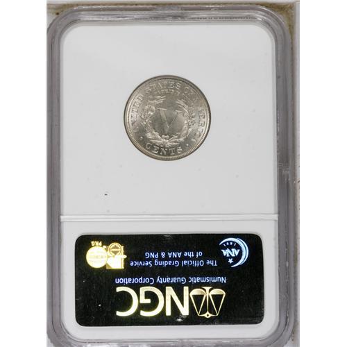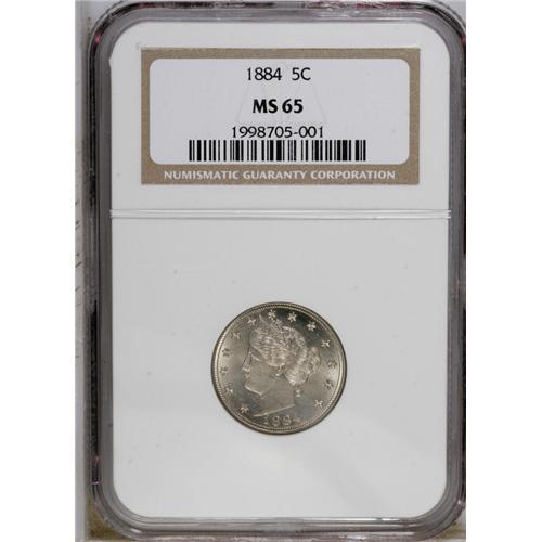 <B>1884<5C> MS65 NGC.</B></I> As is often the case, pieces from this, the second year of issue for the Liberty nickel, are more elusive than their first-year counterparts. Wisps of golden patina appear on the highly lustrous surfaces, and the devices are well-defined. Census: 54 in 65, 14 finer (9/06).