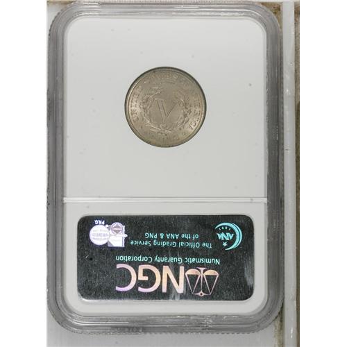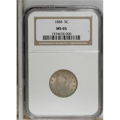 <B>1884 5C MS65 NGC.</B></I> Light silver-gray patina graces each side, deepening to lilac near the reverse rims. The sharp strike brings up even that pesky left ear of corn in the reverse wreath. A light die crack runs through the date digits, the bust tip, and stars 1 and 13.<BR><BR><b>Shipping:</b> Coins & Currency (<a target="_blank" href="http://www.heritageauctions.com/common/shipping.php">view shipping information</a>)