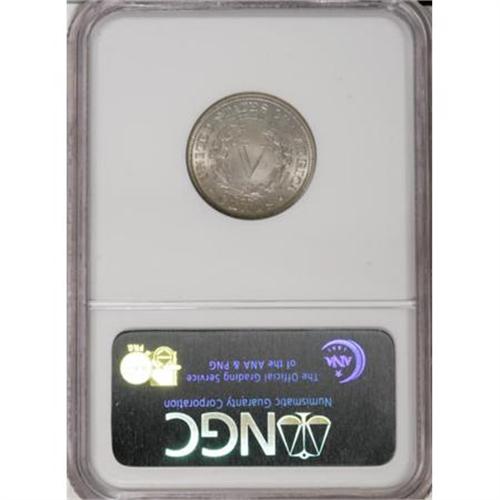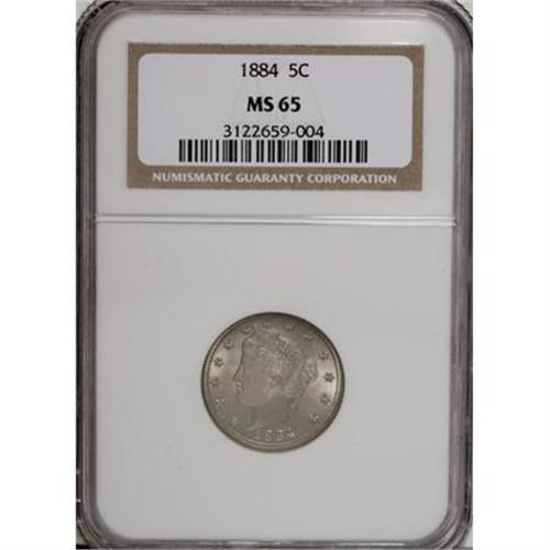 <B>1884 5C MS65 NGC.</B></I> Both sides offer strong, swirling luster with a touch of satin. Both sides offer sage and gold-orange patina, and the strike is generally sharp, though slight softness is evident at the first two stars and the lower wreath. Census: 57 in 65, 15 finer (1/08).<BR><I>From The John Stimson, Sr. Collection, Part Two.</B></I><BR><BR><B>Coin Engraver:</B> Charles E. Barber<BR><BR><b>Shipping:</b> Coins & Currency (<a target="_blank" href="http://www.heritageauctions.com/common/shipping.php">view shipping information</a>)