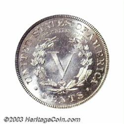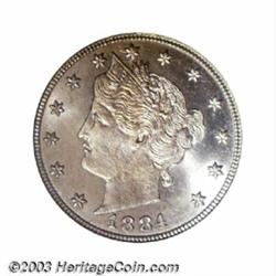 <TR><TD width="100%"><TABLE cellSpacing=1 cellPadding=3 width="100%" border=0><TBODY><TR><TD width="100%" bgColor=#79735c><FONT face=arial color=#ffffff size=3><B>Description</B> </FONT></TD></TR><TR><TD width="100%" bgColor=#ffffff><FONT face=arial size=2><B>1884 5C MS66 PCGS.</B></I> Fully struck, except for trivial softness of detail on the left ear of corn, with radiant satiny luster and clean surfaces. Dappled apricot patina is liberally splashed over each side, enhancing the eye appeal of this premium quality example. The as struck elements of the piece include a lint mark above the tip of Liberty's crown, a spindly die crack near the border on each side, and a number of wispy die polish lines, also seen on both sides. A carefully preserved and highly attractive coin. Population: 8 in 66, 0 finer (4/03). </FONT></TD></TR></TBODY></TABLE></TD></TR></TBODY></TABLE><BR><A name=PricesRealized></A><TABLE cellSpacing=0 cellPadding=0 width="100%" bgColor=#000000 border=0><TBODY><TR><TD width="100%"><TABLE cellSpacing=1 cellPadding=3 width="100%" border=0><TBODY><TR><TD width="100%" bgColor=#79735c><A name=PR><FONT face=arial color=#ffffff size=3><B>Previous Prices from Heritage Auctions</B> </FONT></A></TD></TR><TR><TD bgColor=#f6f6ed>No Prior Data Recorded </TD></TR><TR><TD bgColor=#ffffff><FONT face=arial size=1 ?>PLEASE NOTE: All prices realized reflect the final hammer price PLUS the buyer's premium in auctions that charge a buyer's premium. Each item has a notation at the top of the listing indicating whether that lot included a buyer's premium. Example: A item that sells with a final hammer price of $100 and a 20% buyer's premium will display with a price realized of $120. All information listed is intended to be as accurate as possible, but errors are possible. Please use this guide carefully and inform us of any inaccuracies. </FONT></TD></TR></TBODY></TABLE></TD></TR></TBODY></TABLE><BR><TABLE cellSpacing=0 cellPadding=0 width="100%" bgColor=#000000 border=0><TBODY><TR><TD width="100%"><TABLE cellSpacing=1 cellPadding=3 width="100%" border=0><TBODY><TR><TD width="100%" bgColor=#79735c colSpan=6><FONT face=arial color=#ffffff size=3><B>Price Guide*</B> </FONT></TD></TR><TR bgColor=#f6f6ed><TD align=middle><B>Grade</B> </TD><TD align=middle><B>Coin World<BR>(Trends)</B> </TD><TD align=middle><B>Numismedia<BR>Retail</B> </TD><TD align=middle><B>Numismedia<BR>Wholesale</B> </TD><TD align=middle><B>Coin<BR>Universe</B> </TD><TD align=middle><B>Heritage<BR>Value Index</B> </TD></TR><TR bgColor=#ffffff><TD align=middle>65</TD><TD align=right>$2,000.00</TD><TD align=right>---</TD><TD align=right>$840.00</TD><TD align=right>$2,000.00</TD><TD align=right>$1,258.75</TD></TR><TR style="FONT-WEIGHT: bold" bgColor=#cccfdd><TD align=middle>66</TD><TD align=right>$3,500.00</TD><TD align=right>---</TD><TD align=right>$1,975.00</TD><TD align=right>$5,500.00</TD><TD align=right>$3,150.00</TD></TR><TR bgColor=#ffffff><TD align=middle>67</TD><TD align=right>---</TD><TD align=right>---</TD><TD align=right>$5,850.00</TD><TD align=right>---</TD><TD align=right>---</TD></TR><TR bgColor=#ffffff><TD colSpan=6><FONT size=1>*All information listed is intended to be as accurate as possible, but errors are possible. No item may be returned or refused based on this information which is provided as a service to our customers. You should contact each pricing source directly to determine the accuracy of this information. </FONT></TD></TR></TBODY></TABLE></TD></TR></TBODY></TABLE><BR><TABLE cellSpacing=0 cellPadding=0 width="100%" bgColor=#000000 border=0><TBODY><TR><TD width="100%"><TABLE cellSpacing=1 cellPadding=3 width="100%" border=0><TBODY><TR><TD width="100%" bgColor=#79735c><FONT face=arial color=#ffffff size=3><B>Population Guide</B> </FONT></TD></TR><TR bgColor=#ffffff><TD align=middle><!-- Begin Output of Population Grid--><TABLE cellSpacing=0 cellPadding=0 width="100%" border=0><TBODY><TR><TD vAlign=center><TABLE cellSpacing=0 width="100%" border=1 cellsadding="3"><TBODY><TR><TD vAlign=center><TABLE cellSpacing=0 cellPadding=3 width="100%" border=1><TBODY><TR><TD vAlign=center align=middle bgColor=#f0f1e8 colSpan=2 <CENTER><FONT face=Arial size=2><B>PCGS Pop </B></FONT><CENTER></CENTER></TD><TD vAlign=center align=middle bgColor=#f0f1e8 colSpan=2><CENTER><FONT face=Arial size=2><B>NGC Pop</B></CENTER></FONT></TD></TR><TR><TD vAlign=center><FONT face=Arial size=2>(66)</FONT> </TD><TD vAlign=center align=right><FONT face=Arial size=2>8</FONT> </TD><TD vAlign=center><FONT face=Arial size=2>(66)</FONT> </TD><TD vAlign=center align=right><FONT face=Arial size=2>11</FONT> </TD></TR><TR><TD vAlign=center><FONT face=Arial size=2>(>66)</FONT> </TD><TD vAlign=center align=right><FONT face=Arial size=2>0</FONT> </TD><TD vAlign=center><FONT face=Arial size=2>(>66)</FONT> </TD><TD vAlign=center align=right><FONT face=Arial size=2>1</FONT> </TD></TR></TBODY></TABLE></TD></TR></TBODY></TABLE></TD></TR></TBODY></TABLE><!-- End Output of Population Grid--></TD></TR></TBODY></TABLE></TD></TR></TBODY></TABLE><BR><TABLE cellSpacing=0 cellPadding=0 width="100%" bgColor=#000000 border=0><TBODY><TR> Important notice: We expect to be auctioning lots at the rate of 200-250 per hour. On occasion eBay live bid software cannot keep up with the pace of the auctions where 4-5 lots per minute can hammer down, so we recommend that you place a realistic absentee bid now as insurance to avoid disappointment. Also please note that all Heritage/CAA lots purchased through eBay Live carry a 20% Buyer's Premium. Please make sure you read the Terms and Conditions.
