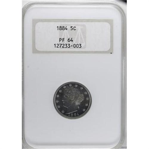 <B>1884 5C PR64 NGC.</B></I> NGC Census: (197/278). PCGS Population (292/242). Mintage: 3,942. Numismedia Wsl. Price for NGC/PCGS coin in PR64: $280. (#3882)<BR><BR><B>Coin Engraver:</B> Charles E. Barber<BR><BR><b>Shipping:</b> Coins & Currency (<a target="_blank" href="http://www.heritageauctions.com/common/shipping.php">view shipping information</a>)