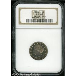 1884 5C PR65 NGC. Bright surfaces reveal touches o <B>1884 5C PR65 NGC.</B></I> Bright surfaces reveal touches of pale blue and light olive-gray color. Nicely struck, with no mentionable marks. <BR><BR><B>Important notice:</B> Heritage usually auctions material at the rate of 200-250 lots per hour. On some occasions eBay Live bid software or the Internet may not be able to keep up with the pace of the auction. We recommend placing a realistic absentee bid now as insurance to avoid disappointment. Occasionally the auctioneer may eliminate or reject an eBay Live bid, and the auctioneer may also reopen a lot after the close of the eBay live bidding (usually because we missed an audience bid), and may reject your bid even if it shows you as the winning bidder. By bidding via eBay Live, you agree that Heritage may award the lot to another bidder at its sole discretion under the circumstances described above or any other reasonable circumstances. Since eBay bids are not shown to us until we open the lot on the floor, we treat those bids just like floor bids. In most cases the floor responds before the eBay bid is presented to us, due to Internet lag time, so for consistency we have made it a policy that floor bids are always considered first over tie eBay live bids. Also please note that all Heritage lots purchased through eBay Live carry a 20% Buyer's Premium. Please make sure you read the Terms and Conditions before you bid. This lot is being auctioned in conjunction with a live floor auction by Heritage Galleries & Auctioneers. All final auction and invoice information will be supplied by Heritage Galleries & Auctioneers, and all other information should be considered preliminary. Lot:5541