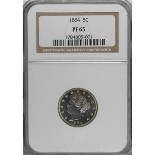 <B>1884 5C PR65 NGC.</B></I> NGC Census: (194/83). PCGS Population (198/44). Mintage: 3,942. Numismedia Wsl. Price for NGC/PCGS coin in PR65: $525. (#3882)<BR><BR><B>Coin Engraver:</B> Charles E. Barber<BR><BR><b>Shipping:</b> Coins & Currency (<a target="_blank" href="http://www.heritageauctions.com/common/shipping.php">view shipping information</a>)