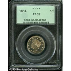 1884 5C PR65 PCGS. A thin veneer of light gold col <B>1884 5C PR65 PCGS.</B></I> A thin veneer of light gold color visits proof surfaces. Sharply struck, save for a touch of softness on the wheat and corn ears to the left of the bow knot. A few tiny, unobtrusive marks are noted in the central reverse. <BR><BR><B>Important notice:</B> Heritage usually auctions material at the rate of 200-250 lots per hour. On some occasions eBay Live bid software or the Internet may not be able to keep up with the pace of the auction. We recommend placing a realistic absentee bid now as insurance to avoid disappointment. Occasionally the auctioneer may eliminate or reject an eBay Live bid, and the auctioneer may also reopen a lot after the close of the eBay live bidding (usually because we missed an audience bid), and may reject your bid even if it shows you as the winning bidder. By bidding via eBay Live, you agree that Heritage may award the lot to another bidder at its sole discretion under the circumstances described above or any other reasonable circumstances. Since eBay bids are not shown to us until we open the lot on the floor, we treat those bids just like floor bids. In most cases the floor responds before the eBay bid is presented to us, due to Internet lag time, so for consistency we have made it a policy that floor bids are always considered first over tie eBay live bids. Also please note that all Heritage lots purchased through eBay Live carry a 20% Buyer's Premium. Please make sure you read the Terms and Conditions before you bid. This lot is being auctioned in conjunction with a live floor auction by Heritage Galleries & Auctioneers. All final auction and invoice information will be supplied by Heritage Galleries & Auctioneers, and all other information should be considered preliminary. Lot:5542