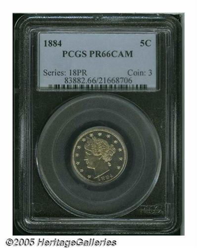 <B>1884<5C> PR66 Cameo PCGS.</B></I> Pretty cameo surfaces that are nearly untoned, and devoid of any significant marks. The design elements are sharply struck, though the corn ear and leaves to the left of the bow knot are a tad soft. Population: 22 in 66, 2 finer (5/05).