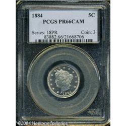 1884 5C PR66 Cameo PCGS. Pretty cameo surfaces tha <B>1884 5C PR66 Cameo PCGS.</B></I> Pretty cameo surfaces that are nearly untoned, and devoid of any significant marks. The design elements are sharply struck throughout. Population: 20 in 66, 2 finer (11/04). <BR><BR><B>Important notice:</B> Heritage usually auctions material at the rate of 200-250 lots per hour. On some occasions eBay Live bid software or the Internet may not be able to keep up with the pace of the auction. We recommend placing a realistic absentee bid now as insurance to avoid disappointment. Occasionally the auctioneer may eliminate or reject an eBay Live bid, and the auctioneer may also reopen a lot after the close of the eBay live bidding (usually because we missed an audience bid), and may reject your bid even if it shows you as the winning bidder. By bidding via eBay Live, you agree that Heritage may award the lot to another bidder at its sole discretion under the circumstances described above or any other reasonable circumstances. Since eBay bids are not shown to us until we open the lot on the floor, we treat those bids just like floor bids. In most cases the floor responds before the eBay bid is presented to us, due to Internet lag time, so for consistency we have made it a policy that floor bids are always considered first over tie eBay live bids. Also please note that all Heritage lots purchased through eBay Live carry a 20% Buyer's Premium. Please make sure you read the Terms and Conditions before you bid. This lot is being auctioned in conjunction with a live floor auction by Heritage Galleries & Auctioneers. All final auction and invoice information will be supplied by Heritage Galleries & Auctioneers, and all other information should be considered preliminary. Lot:5543