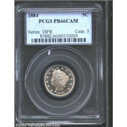 <TABLE cellSpacing=0 cellPadding=0 width="100%" bgColor=#000000 border=0><TBODY><TR><TD width="100%"><TABLE cellSpacing=1 cellPadding=3 width="100%" border=0><TBODY><TR><TD width="100%" bgColor=#79735c><FONT face=arial color=#ffffff size=3><B>Description</B> </FONT></TD></TR><TR><TD width="100%" bgColor=#ffffff><FONT face=arial size=2><B>1884 5C PR66 Cameo PCGS.</B></I> Outstanding cameo contrast shows over the surfaces of this brilliant nickel. The only detractor from the eye appeal is a small distraction over the upper left portion of the V on the reverse. Population: 7 in 66, 0 finer (4/03). </FONT></TD></TR></TBODY></TABLE></TD></TR></TBODY></TABLE><BR><A name=PricesRealized></A><TABLE cellSpacing=0 cellPadding=0 width="100%" bgColor=#000000 border=0><TBODY><TR><TD width="100%"><TABLE cellSpacing=1 cellPadding=3 width="100%" border=0><TBODY><TR><TD width="100%" bgColor=#79735c><A name=PR><FONT face=arial color=#ffffff size=3><B>Previous Prices from Heritage Auctions</B> </FONT></A></TD></TR><TR><TD bgColor=#f6f6ed><TABLE cellSpacing=0 cellPadding=0 width="100%" border=1><TBODY><TR><TD align=middle width="33%"><B>Date</B></TD><TD align=middle width="33%"><B>Service</B></TD><TD align=middle width="33%"><B>Price</B></TD></TR><TR bgColor=whitesmoke><TD width="33%"><B>07/29/2003</B></TD><TD width="33%">PCGS</TD><TD width="33%">$1,610.00</TD></TR><TR bgColor=whitesmoke><TD width="33%"><B>09/28/2002</B></TD><TD width="33%">PCGS</TD><TD width="33%">$948.75</TD></TR><TR bgColor=whitesmoke><TD width="33%"><B>05/31/2003</B></TD><TD width="33%">NGC</TD><TD width="33%">$1,006.25</TD></TR></TBODY></TABLE></TD></TR><TR><TD bgColor=#ffffff><FONT face=arial size=1 ?>PLEASE NOTE: All prices realized reflect the final hammer price PLUS the buyer's premium in auctions that charge a buyer's premium. Each item has a notation at the top of the listing indicating whether that lot included a buyer's premium. Example: A item that sells with a final hammer price of $100 and a 20% buyer's premium will display with a price realized of $120. All information listed is intended to be as accurate as possible, but errors are possible. Please use this guide carefully and inform us of any inaccuracies. </FONT></TD></TR></TBODY></TABLE></TD></TR></TBODY></TABLE><BR><TABLE cellSpacing=0 cellPadding=0 width="100%" bgColor=#000000 border=0><TBODY><TR><TD width="100%"><TABLE cellSpacing=1 cellPadding=3 width="100%" border=0><TBODY><TR><TD width="100%" bgColor=#79735c colSpan=6><FONT face=arial color=#ffffff size=3><B>Price Guide*</B> </FONT></TD></TR><TR bgColor=#f6f6ed><TD align=middle><B>Grade</B> </TD><TD align=middle><B>Coin World<BR>(Trends)</B> </TD><TD align=middle><B>Numismedia<BR>Retail</B> </TD><TD align=middle><B>Numismedia<BR>Wholesale</B> </TD><TD align=middle><B>Coin<BR>Universe</B> </TD><TD align=middle><B>Heritage<BR>Value Index</B> </TD></TR><TR bgColor=#ffffff><TD align=middle>65</TD><TD align=right>---</TD><TD align=right>---</TD><TD align=right>---</TD><TD align=right>---</TD><TD align=right>$666.25</TD></TR><TR style="FONT-WEIGHT: bold" bgColor=#cccfdd><TD align=middle>66</TD><TD align=right>---</TD><TD align=right>---</TD><TD align=right>---</TD><TD align=right>---</TD><TD align=right>---</TD></TR><TR bgColor=#ffffff><TD align=middle>67</TD><TD align=right>---</TD><TD align=right>---</TD><TD align=right>---</TD><TD align=right>---</TD><TD align=right>---</TD></TR><TR bgColor=#ffffff><TD colSpan=6><FONT size=1>*All information listed is intended to be as accurate as possible, but errors are possible. No item may be returned or refused based on this information which is provided as a service to our customers. You should contact each pricing source directly to determine the accuracy of this information. </FONT></TD></TR></TBODY></TABLE></TD></TR></TBODY></TABLE><BR><TABLE cellSpacing=0 cellPadding=0 width="100%" bgColor=#000000 border=0><TBODY><TR><TD width="100%"><TABLE cellSpacing=1 cellPadding=3 width="100%" border=0><TBODY><TR><TD width="100%" bgColor=#79735c><FONT face=arial color=#ffffff size=3><B>Population Guide</B> </FONT></TD></TR><TR bgColor=#ffffff><TD align=middle><!-- Begin Output of Population Grid--><TABLE cellSpacing=0 cellPadding=0 width="100%" border=0><TBODY><TR><TD vAlign=center><TABLE cellSpacing=0 width="100%" border=1 cellsadding="3"><TBODY><TR><TD vAlign=center><TABLE cellSpacing=0 cellPadding=3 width="100%" border=1><TBODY><TR><TD vAlign=center align=middle bgColor=#f0f1e8 colSpan=2 <CENTER><FONT face=Arial size=2><B>PCGS Pop </B></FONT><CENTER></CENTER></TD><TD vAlign=center align=middle bgColor=#f0f1e8 colSpan=2><CENTER><FONT face=Arial size=2><B>NGC Pop</B></CENTER></FONT></TD></TR><TR><TD vAlign=center><FONT face=Arial size=2>(66)</FONT> </TD><TD vAlign=center align=right><FONT face=Arial size=2>4</FONT> </TD><TD vAlign=center><FONT face=Arial size=2>(66)</FONT> </TD><TD vAlign=center align=right><FONT face=Arial size=2>10</FONT> </TD></TR><TR><TD vAlign=center><FONT face=Arial size=2>(>66)</FONT> </TD><TD vAlign=center align=right><FONT face=Arial size=2>0</FONT> </TD><TD vAlign=center><FONT face=Arial size=2>(>66)</FONT> </TD><TD vAlign=center align=right><FONT face=Arial size=2>6</FONT> </TD></TR></TBODY></TABLE></TD></TR></TBODY></TABLE></TD></TR></TBODY></TABLE><!-- End Output of Population Grid--> Important notice: Heritage usually auctions material at the rate of 200-250 lots per hour. On some occasions eBay Live bid software or the Internet may not be able to keep up with the pace of the auction. We recommend placing a realistic absentee bid now as insurance to avoid disappointment. Occasionally the auctioneer may eliminate or reject an eBay Live bid, and the auctioneer may also reopen a lot after the close of the eBay live bidding (usually because we missed an audience bid), and may reject your bid even if it shows you as the winning bidder. By bidding via eBay Live, you agree that Heritage may award the lot to another bidder at its sole discretion under the circumst