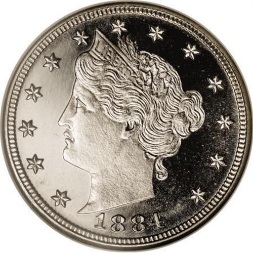<B>1884 5C PR67 Cameo NGC.</B></I> Outstanding white-on-black contrast jumps out at the viewer of this Superb Gem Cameo. The strike is solid, emboldening all of the design elements, including the ear of corn and leaves to the left of the ribbon bow. Untoned surfaces are immaculately preserved. Census: 12 in 67 Cameo, 2 finer (6/07).<BR><BR><b>Shipping:</b> Coins & Currency (<a target="_blank" href="http://www.heritageauctions.com/common/shipping.php">view shipping information</a>\)