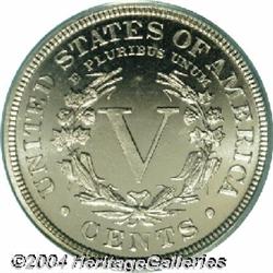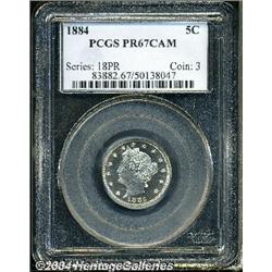<B>1884<5C> PR67 Cameo PCGS.</B></I> An important condition rarity, the present Superb Gem is silky-smooth from rim to rim. Razor sharp striking definition characterizes all features, and the warmly frosted devices contrast nicely with the deeply mirrored, glassy fields. Untoned. Population: 2 in 67 Cameo, none are finer at PCGS (9/04). <BR><BR><B>Important notice:</B> Heritage usually auctions material at the rate of 200-250 lots per hour. On some occasions eBay Live bid software or the Internet may not be able to keep up with the pace of the auction. We recommend placing a realistic absentee bid now as insurance to avoid disappointment. Occasionally the auctioneer may eliminate or reject an eBay Live bid, and the auctioneer may also reopen a lot after the close of the eBay live bidding (usually because we missed an audience bid), and may reject your bid even if it shows you as the winning bidder. By bidding via eBay Live, you agree that Heritage may award the lot to another bidder at its sole discretion under the circumstances described above or any other reasonable circumstances. Since eBay bids are not shown to us until we open the lot on the floor, we treat those bids just like floor bids. In most cases the floor responds before the eBay bid is presented to us, due to Internet lag time, so for consistency we have made it a policy that floor bids are always considered first over tie eBay live bids. Also please note that all Heritage lots purchased through eBay Live carry a 20% Buyer's Premium. Please make sure you read the Terms and Conditions before you bid.