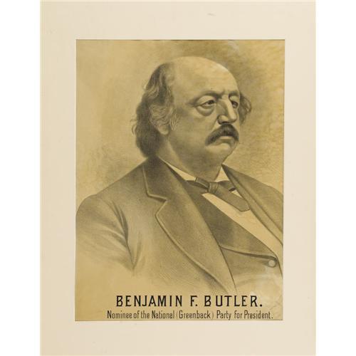 <B>Scarce 1884 Ben Butler for President Campaign Poster.</B></I> While large prints picturing the well-known Butler are not as rare, an expressly political poster like this is quite nice. Matting covers some typical edge tears and roughness, but the 15" x 20.5" area shown is in excellent condition.