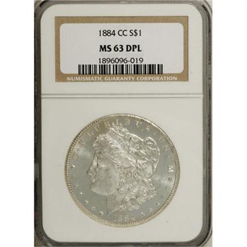 <B>1884-CC $1 MS63 Deep Mirror Prooflike NGC.</B></I> NGC Census: (296/788). PCGS Population (683/1769). Numismedia Wsl. Price for NGC/PCGS coin in MS63: $400. (#97153)<BR><BR><b>Shipping:</b> Coins & Currency (<a target="_blank" href="http://www.heritageauctions.com/common/shipping.php">view shipping information</a>)